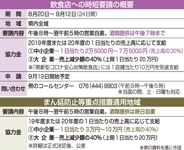 県は20日から、県内の飲食店と喫茶店に営業時間を午後8時までとするよう求める。県独自の警戒レベルを最も高い「ステージ3」に引き上げたことに伴い、感染防止を徹底するのが目的。国のまん延防止等重点措置の適用地域(富山市)では、お酒の提供も自粛してもらう。期間は9月12日まで。
