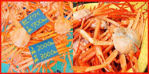 富山湾の秋の味覚、ベニズワイガニの今シーズンの初競りが2日、新湊漁港で行われ、競り場に色鮮やかなカニがずらりと並びました。