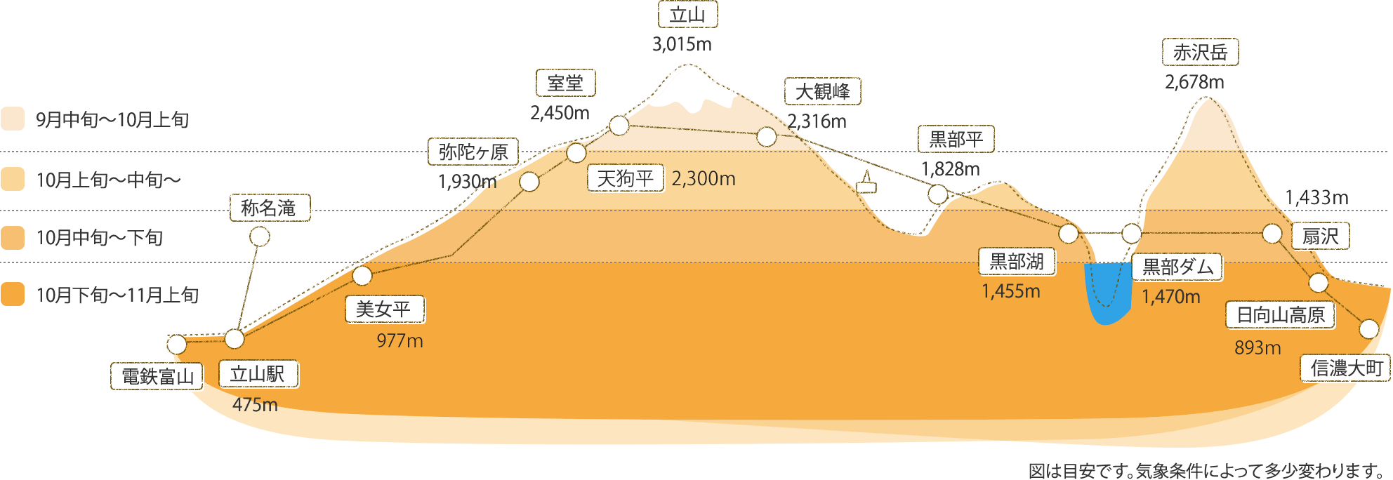山頂から麓にかけて標高差が1,975mもあるため、様々な場所で時期をずらしながら紅葉観賞ができます。