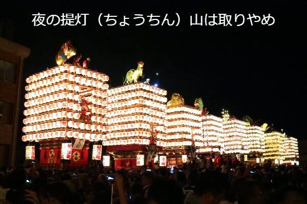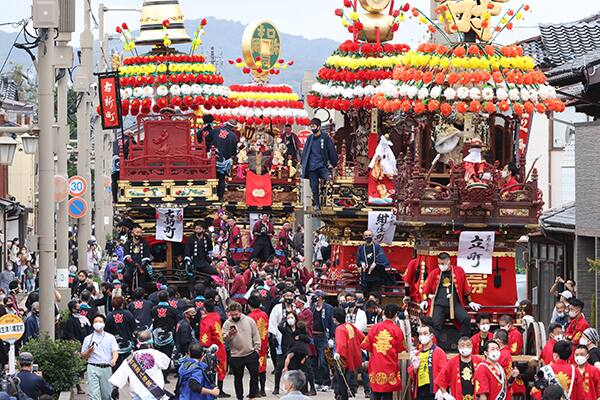 今年は感染対策として、曳山の巡行時間を昼頃までに短縮し、夜の提灯(ちょうちん)山は取りやめました。