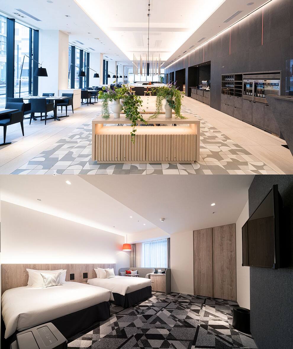ホテルは10階建てで、客室はツインとダブルの252室。自動チェックイン機や売店のセルフレジなどデジタル機器を導入し、利便性向上につなげる。また、一般客も利用できるレストラン「カフェ コントレイル」を1階に併設しています。