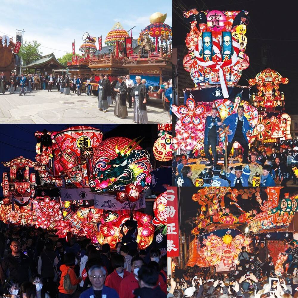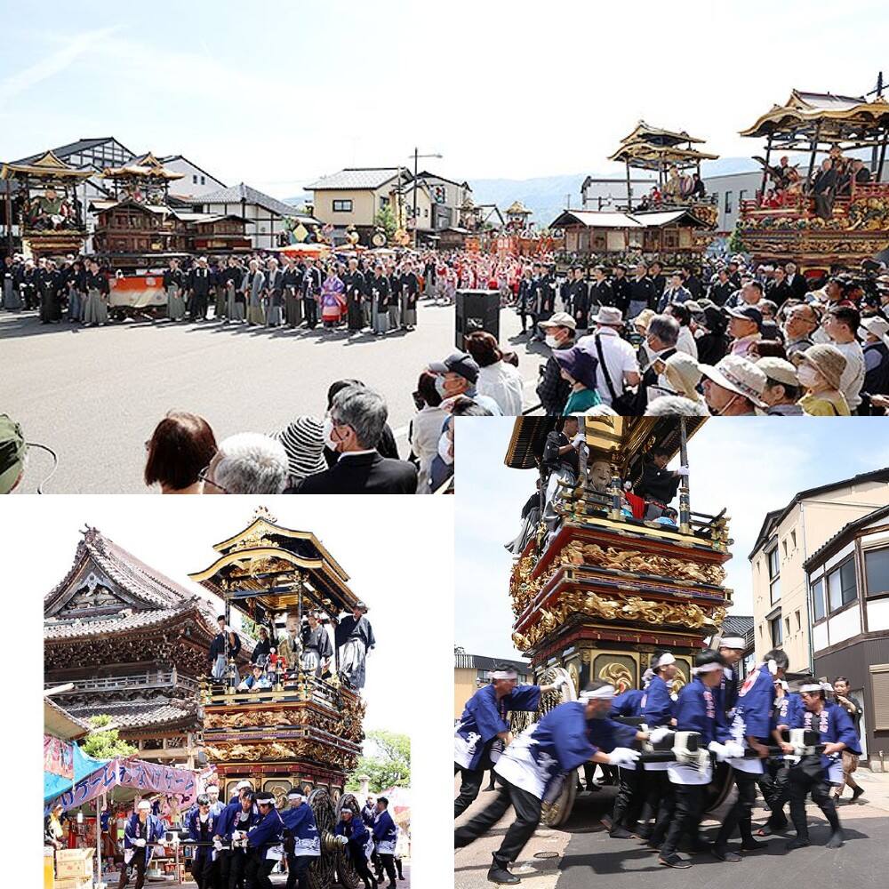 同祭は八尾八幡社(下新町)の春季祭礼で、280年以上の歴史があります。1741(寛保元)年、上新町の花山に人形と役者を乗せて引き回したのが始まりとされる。6基とも県有形民俗文化財に指定されています。