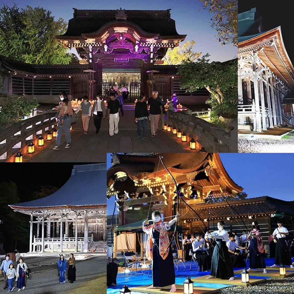 勝興寺(富山県高岡市伏木古国府)の国宝指定1周年を祝うライトアップ企画「黄葉(こうよう)フェスティバル」の第2弾が3日、始まりました。キャンドルやランタンの揺らめく明かりに、江戸時代後期を代表する寺院建築が浮かび上がり、周囲は幻想的な雰囲気に包まれました。境内で弓道大会が開かれたほか、地元の飲食店の販売テントも設けられ、にぎわいました。