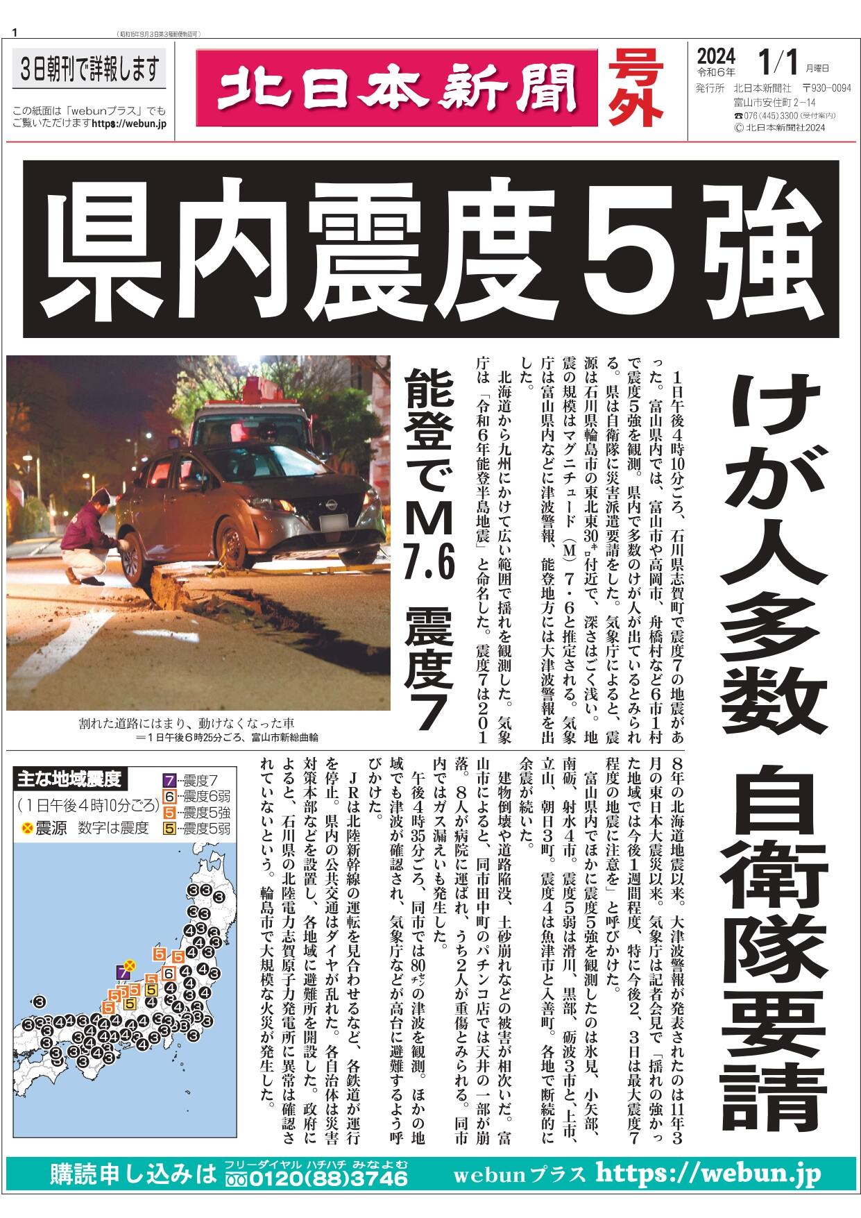 気象庁によると、1日午後4時10分ごろ、石川県能登を震源とする地震が発生し、志賀町で震度7を観測、富山県内では最大震度5強を観測しました。地震の規模を示すマグニチュードは7・6。気象庁は富山県内に津波警報、石川県能登に一時、大津波警報を出しました。海の近くからすぐ避難するよう呼びかけています。気象庁によると、大津波警報が発表されたのは2011年3月の東日本大震災以来で、マグニチュード7・6は記録が残る1885年以降で最大。富山県は午後7時45分、自衛隊へ災害派遣要請を行いました。