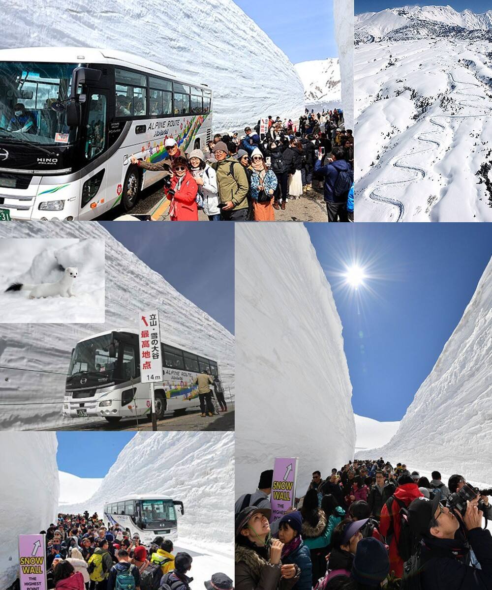 目玉スポット「雪の大谷」では、道路の両側にそびえ立つ雪壁の間を観光客が散策。スマートフォンで写真を撮ったり、迫力ある雪の大谷を見上げたりして楽しんでいました。今年の雪の最高地点は高さ14メートルで、暖冬の影響で史上最低となった昨年より1メートル高いそうです。