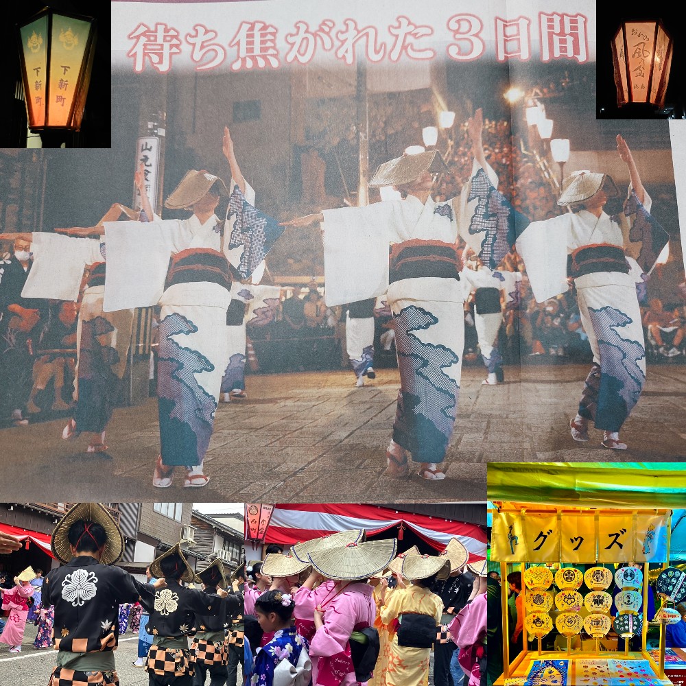 「越中八尾おわら風の盆」は3日、最終日を終え閉幕いたしました。1日は約7万人、2日は約2万人、3日は約4万人、3日間で約13万人の観光客が訪れ、秋の風物詩・11町を魅了・堪能いたしました。ちまみに去年は開催日(金)(土)(日)の週末とコロナ禍明けも相まって、約20万人の観光客が訪れました。ノロノロ台風の影響で残念ながら控えられた観光客の皆様も居られた見たいです。