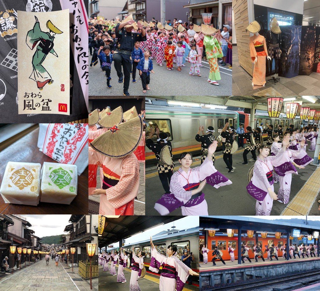 「越中八尾おわら風の盆」の最終日明けには、観光客の間で通になっているJR八尾駅で「見送りおわら」という恒例イベントが行われました。観光客に別れを告げる為に始発列車の出発前に福島地区の若手男女の舞が披露され、なごり惜しむ観光客は列車の窓際に顔を寄せて舞に見入っていました。