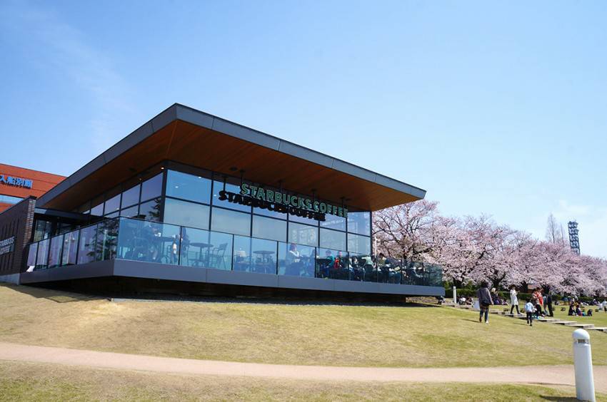 富山駅から近郊で公園内にある世界で一番美しい場所にあるスターバックスコーヒー店、癒しの一時を。近くに美術館そしてフレンチ、イタリアンの食事処もあり昼夜問わず人気で地元の若者のデートスポット。